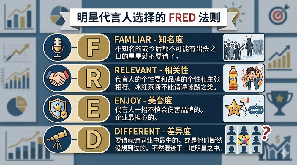 是否请和请谁作为品牌代言人,确实费思量。首先把当红和将当红的明星全部列举出来,然后用FRED法则来判断,简单明了,有说服力。F FOR FAMLIAR,知名度:不知名的或今后都不可能有出头之日的星星就不要请了。