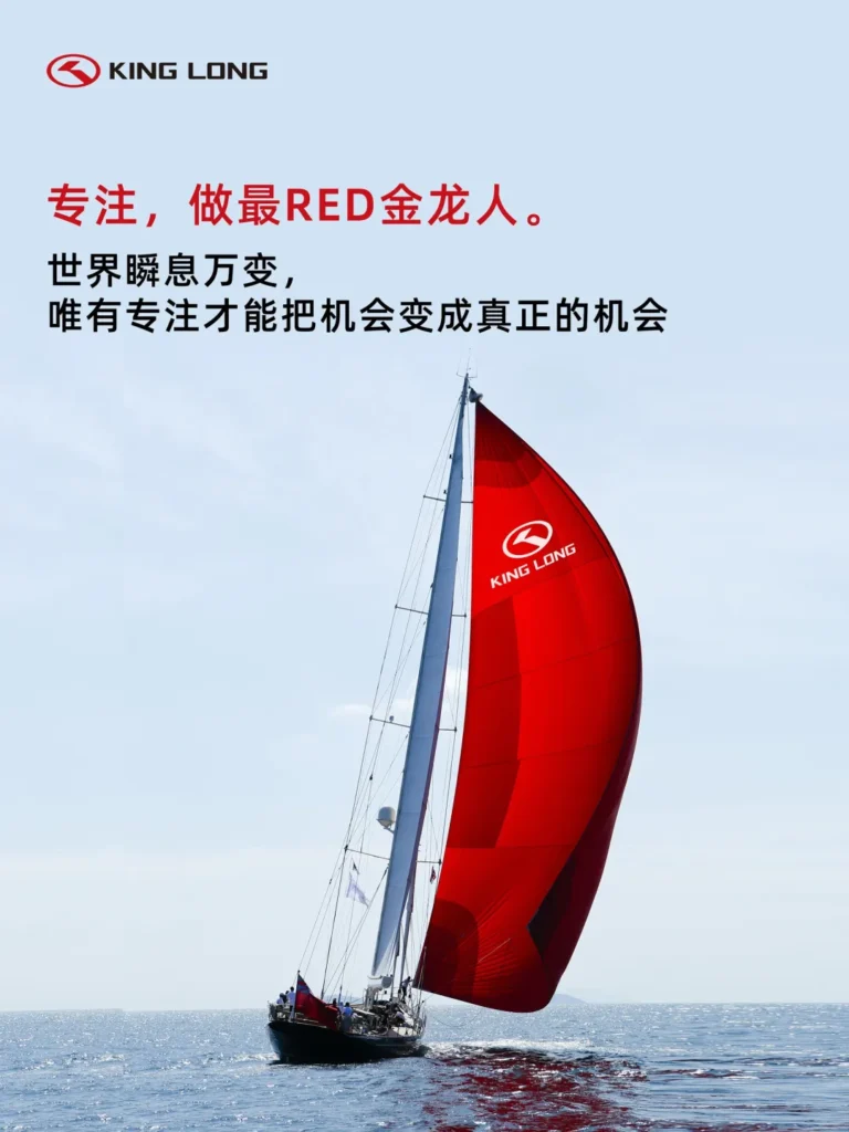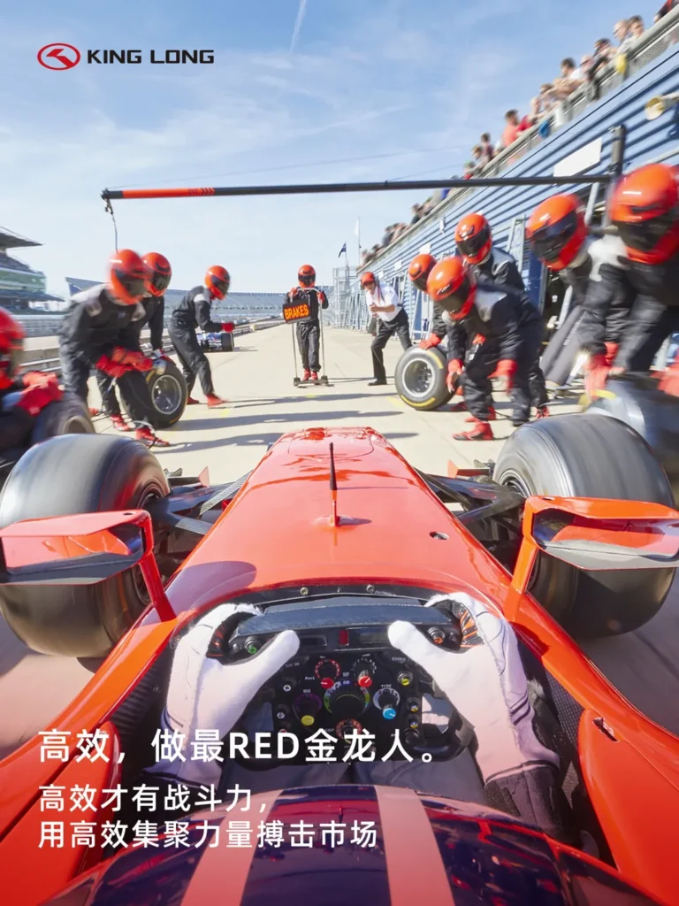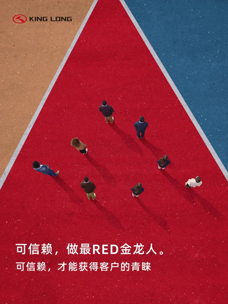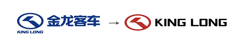方案:LOGO组合去除中文“金龙客车”,以“人字标+KING LONG” 为金龙LOGO标准组合。凸显RED(Reliable, Efficient, Dedicated) 文化,LOGO组合配色改成Pantone 3517C赛道红图形标+ 纯黑英文字组合,且调整字体比列和倾斜度,去除重工和不稳定感。
