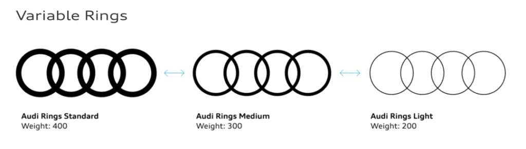 而奥迪本身的品牌识别,在2021年有了很大的变化,最大的特色就是flexible灵活设计。车标不仅是扁平了,而且线条粗细和Audi文字一样,粗细可以根据排版需要,灵活变化。
